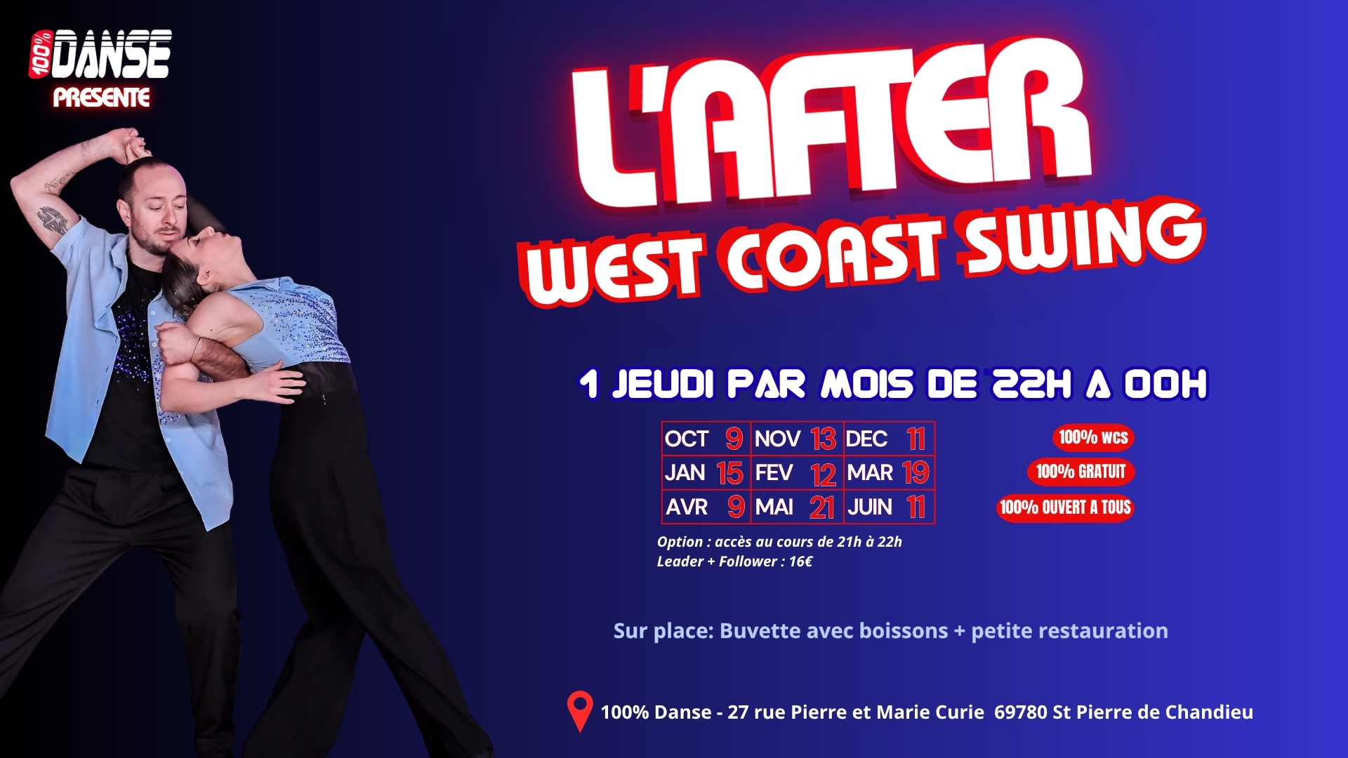 Soirée de pratique West Coast Swing ! Un jeudi par mois, retrouvez notre soirée de pratique 100 % West Coast Swing, à vivre chez 100 % Danse 21h – 22h : Cours + pratique encadrée Tarif solo: 10€ - Tarif duo (leader + follower) : 16 € 22h – 00h : Soirée 100 % West...